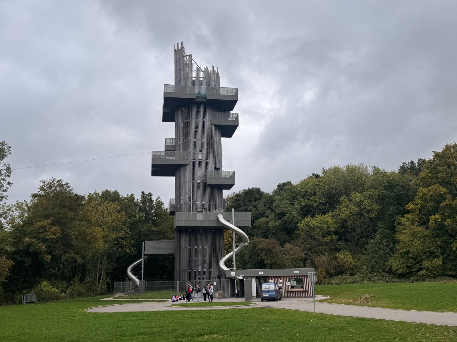 Een knots van een uitkijktoren met glijbanen naar beneden